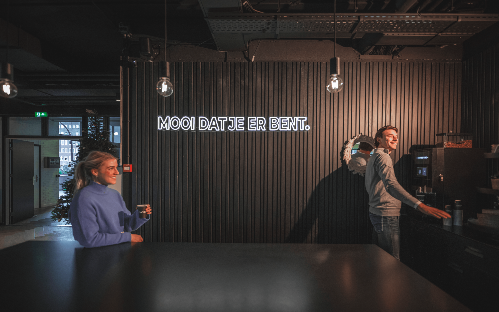 Very satisfied with the neon sign from Neonsfeer. It instantly makes the space feel cosier and adds more character to the office. Even our office dog seems perfectly happy with it and loves lying nearby, which really says it all.